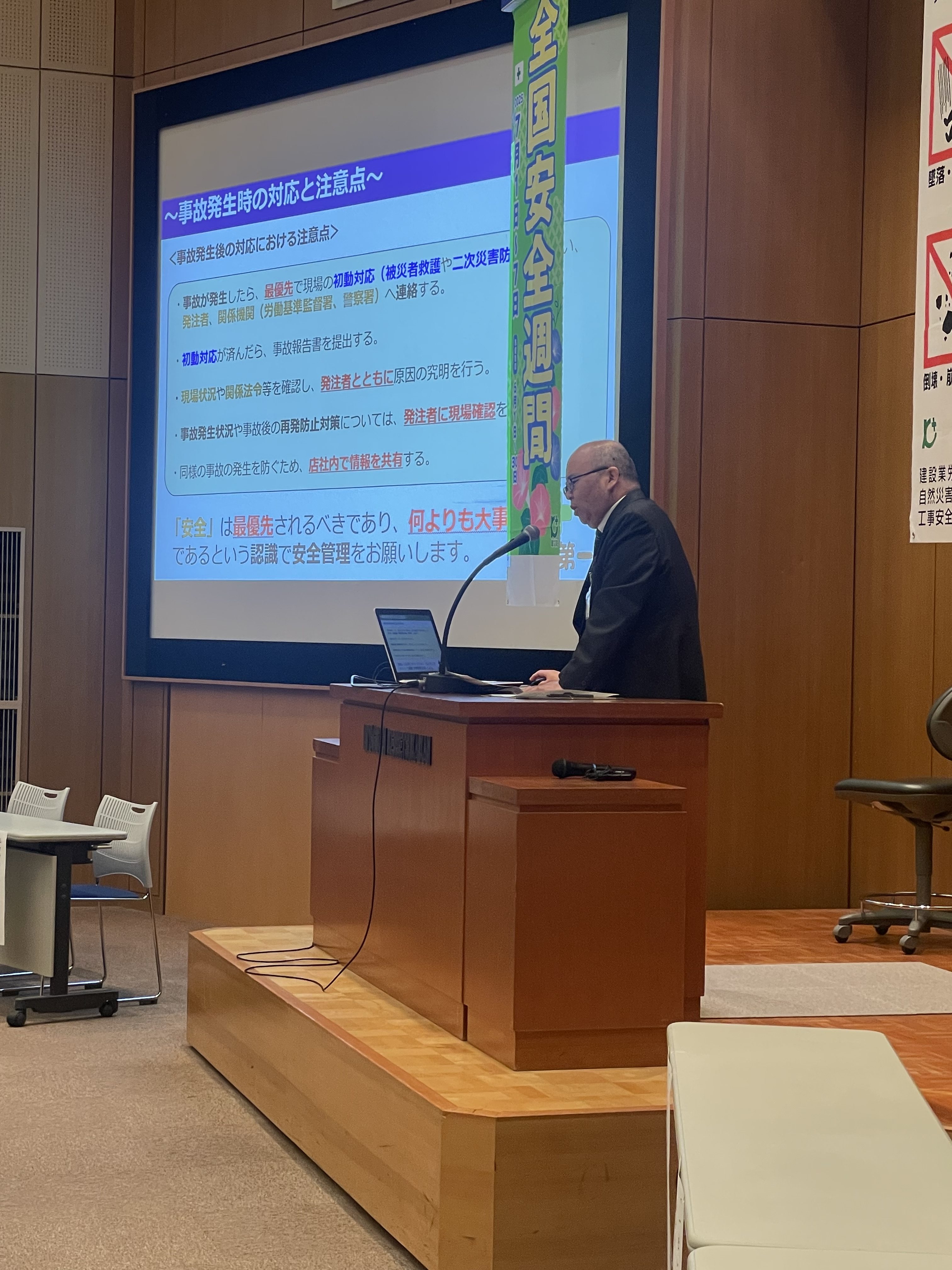 初めに当協会事務局より令和6年度の事業並びに令和7年度の事業計画について報告し、続いて仙台市都市整備局 技術管理室 伊藤主幹より「仙台市における事故発生状況と安全対策スローガンについて」、仙台労働基準監督署 砂澤 地方産業安全専門官より「建設業における令和6年度の労働災害発生状況と最近の法令等改正について」と題しましてご講演をいただきました。