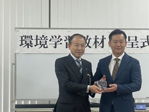令和7年11月13日(木)に環境福祉委員長および環境福祉委員3名と事務局が、せんだい環境学習館「たまきさんサロン」(東北大学大学院環境科学研究科1階)を訪問し、環境学習教材(蛍光鉱物観察装置と鉱物一式、書籍8冊)を贈呈いたしました。