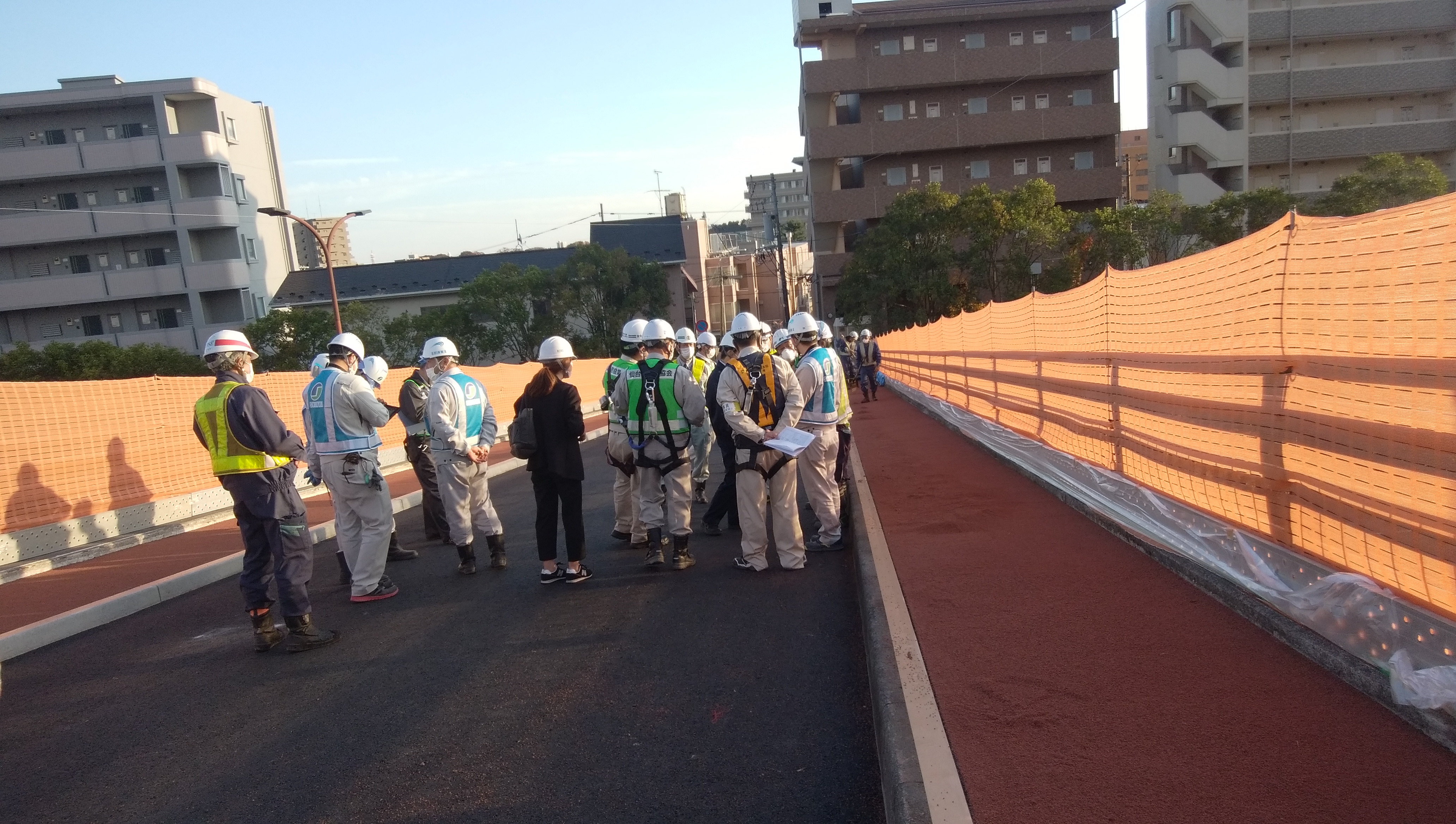 今回は、土木、建築、各1現場を点検し、土木の現場では、勾配のきつい橋梁の歩道の薄層舗装を巡視した。車両に輪留めをし逸走を防止、また、柵を養生し落下物や溶剤などの飛散を防止する公衆衛生対策も徹底されており、安全指導員からは「よく管理されている」と評価されていました。